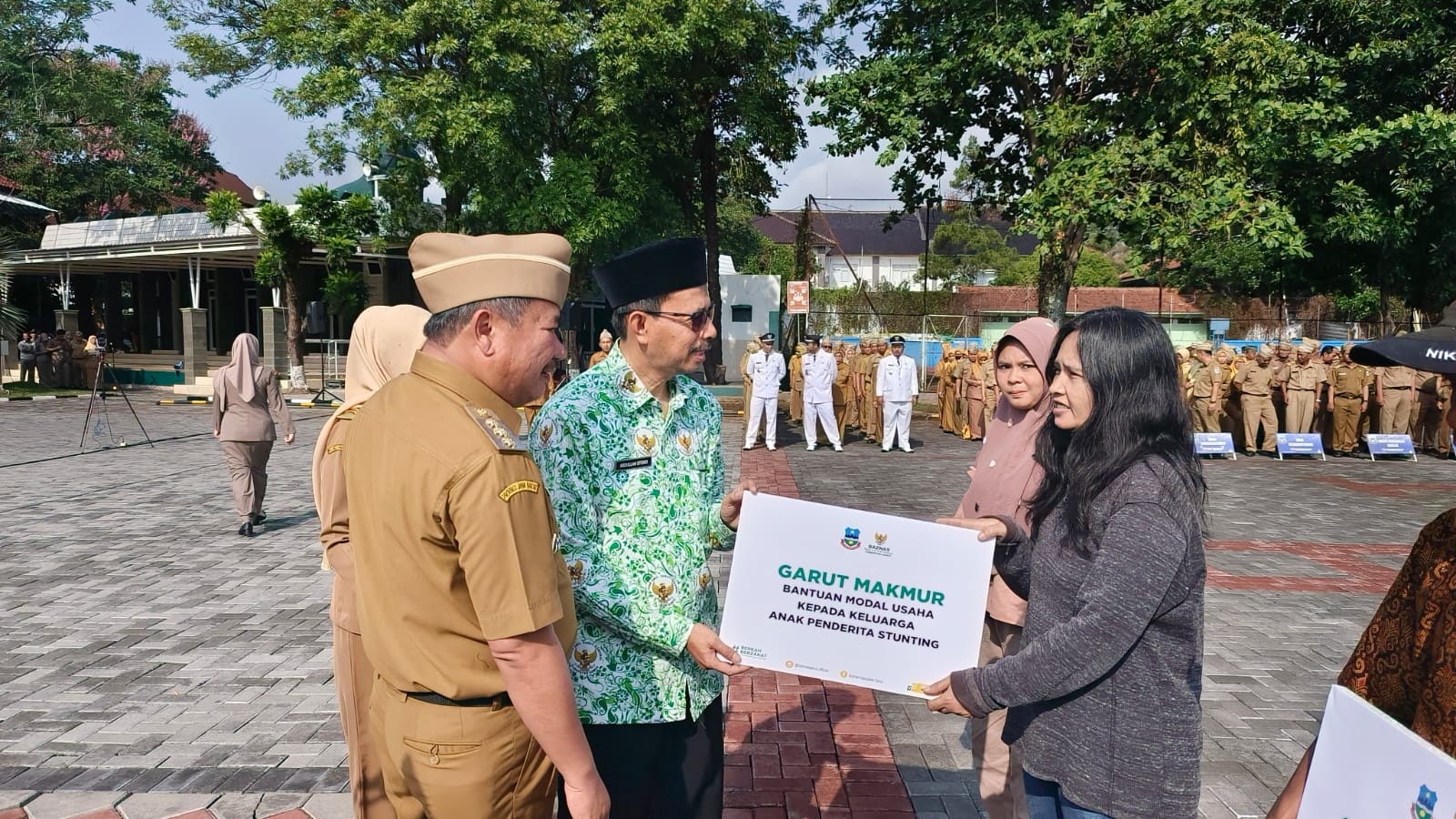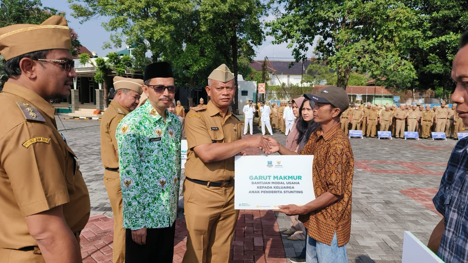 Badan Amil Zakat Nasional (BAZNAS) Kabupaten Garut memberikan bantuan modal usaha dan santunan kepada keluarga balita stunting. Bupati Garut, Rudy Gunawan, secara simbolis menyerahkan bantuan tersebut pada apel gabungan terbatas di Lapangan Sekretariat Daerah, Senin (13/11/2023).