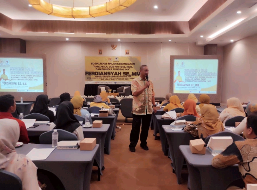 Sinar Priangan News – Garut, Anggota MPR RI Fraksi Golkar, Ferdiansyah, SE.,MM, menggelar sosialisasi Empat Pilar Kebangsaan (Pancasila, UUD 1945, Negara Kesatuan Republik Indonesia dan Bhineka Tunggal Ika), di Ballroom Fave hotel Rabu Pagi 14/08/24.