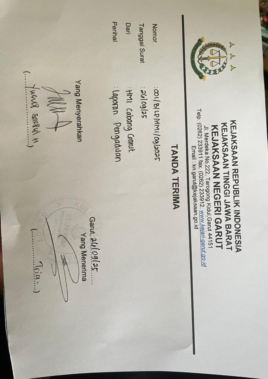 Laporan pengaduan bernomor 001/B/LP/HMI/09/2025 itu disampaikan langsung oleh Ketua Umum HMI Cabang Garut, Yusup Saepul Hayat, setelah pihaknya melakukan investigasi lapangan.