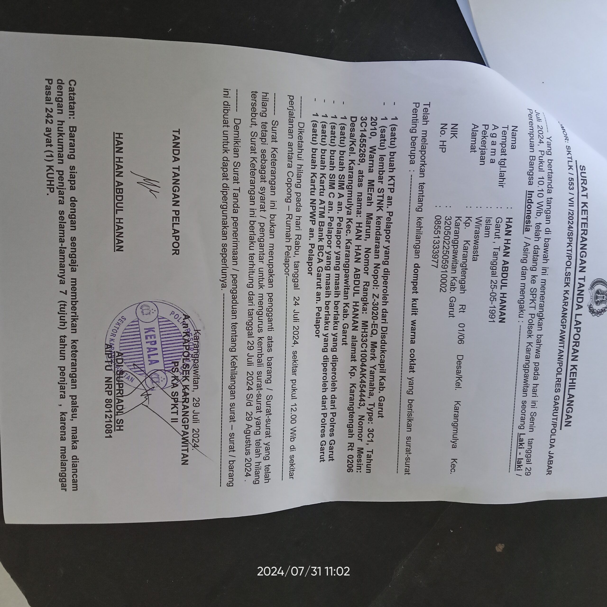 Han Han Abdul Hanan yang beralamat di Kampung Karang tengah RT 01 RW 06 Desa Karangmulya kecamatan Karangpawitan Kabupaten Garut,Telah kehilangan dokumen penting berupa KTP dan STNK Motor denga Merk Yamaha 3C1 tahun 2010 dengan Nopol Z-3020 warna merah marun Nomor Rangka MH33C1004AK454443 Nomor Mesin 3C1455269 Atas nama HAN HAN ABDUL HANAN.