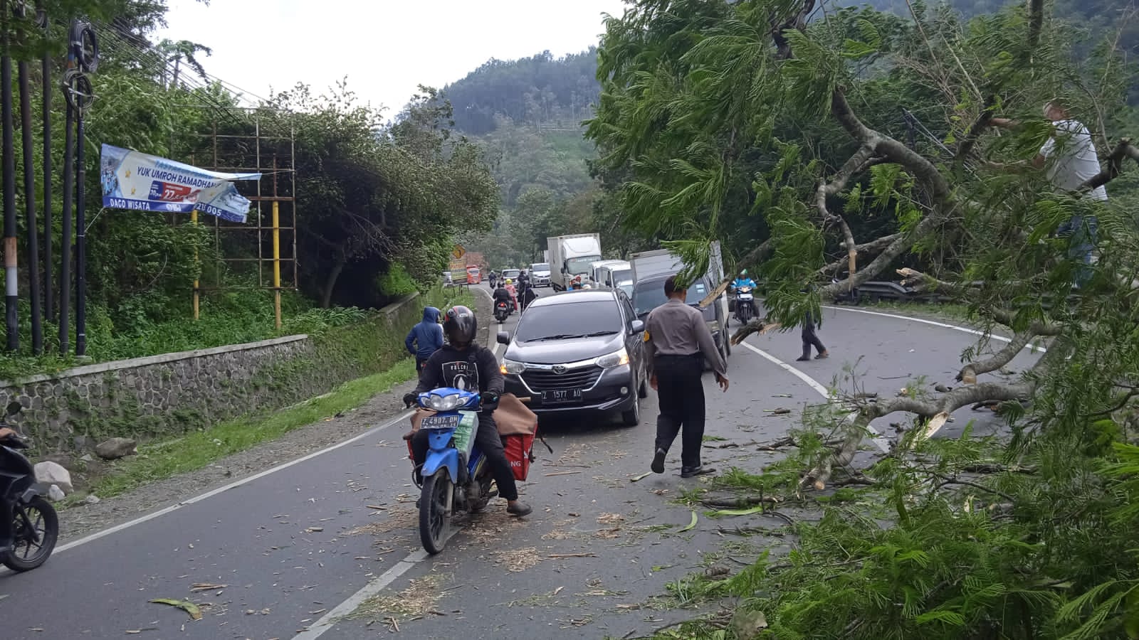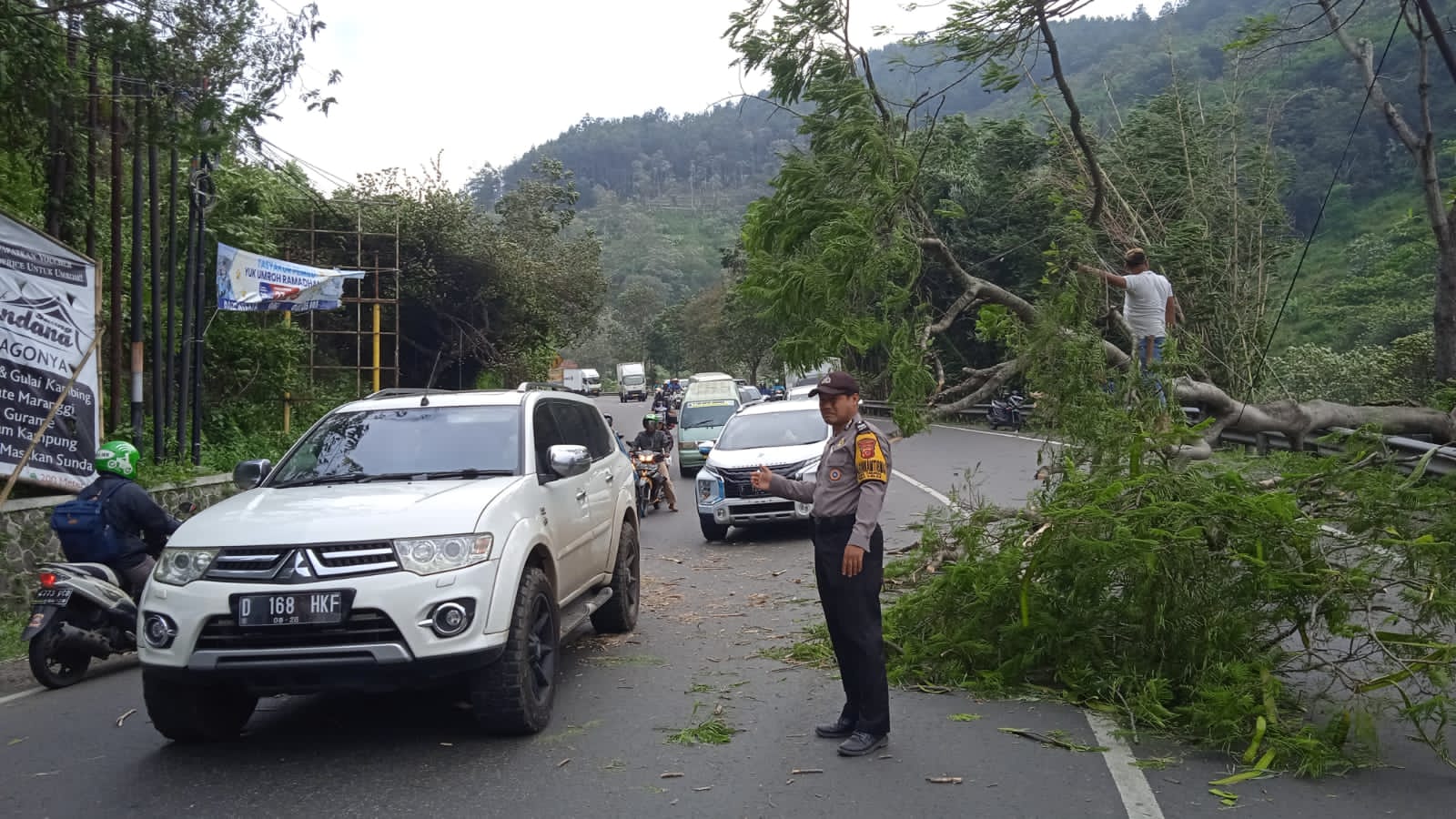 Kapolres Garut AKBP Rohman Yonky Dilatha, S.I.K., M.Si., melalui Kapolsek Leles AKP Agus Kustanto, S.H., saat dikonfirmasi membenarkan adanya pohon tumbang yang menutupi Jalan Raya Tutugan Leles dan sudah ditindaklanjuti oleh petugas kepolisian bersama masyarakat.