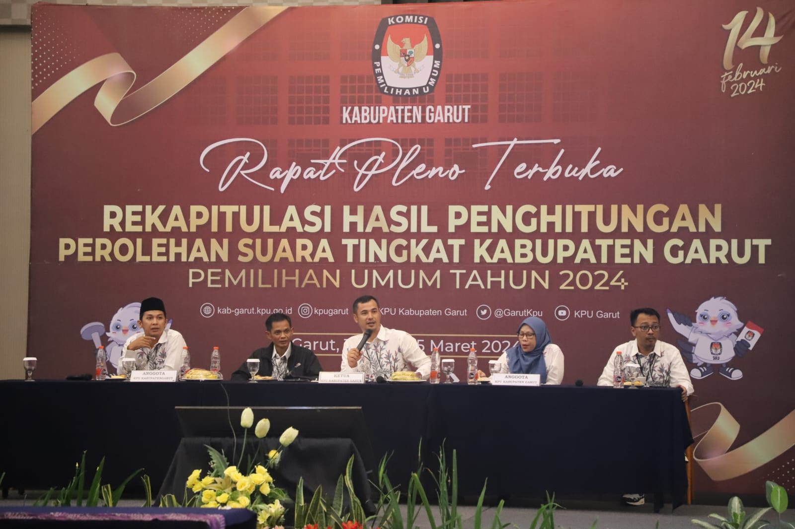 Komisi Pemilihan Umum (KPU) Kabupaten Garut menggenjot pelaksanaan pembacaan hasil rekapitulasi perolehan suara Pemilihan Umum (Pemilu) 2024 di tiap kecamatan. Rapat Pleno Terbuka Rekapitulasi Hasil Penghitungan Perolehan Suara Pemilu 2024 tingkat Kabupaten Garut berlangsung di Ballroom Hotel Harmoni, Jalan Cipanas Baru, Kecamatan Tarogong Kaler, Kabupaten Garut. Hingga Sabtu malam (2/3/2024), 20 kecamatan telah melaporkan hasil rekapitulasi perolehan suara Pemilu 2024.