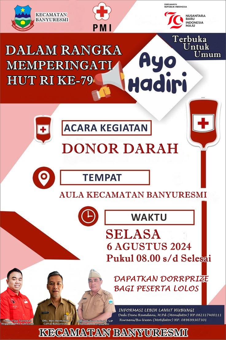 Buat warga banyuresmi hari selasa tanggal 6 agustus 2024 ada kegiatan donor darah di aula kecamatan banyuresmi….ayo bantu sesama…setetes darah menyelamatkan nyawa….!!